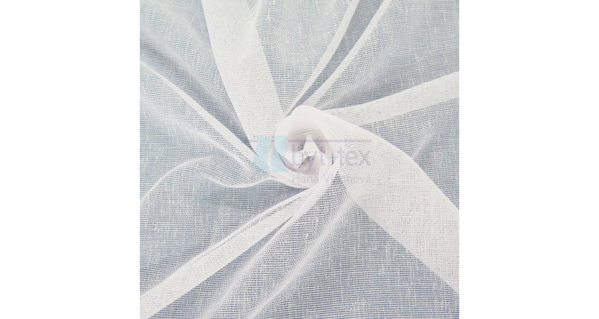 Krásný bílý voál přírodního vzhledu s obsahem lnu se síťovanou strukturou. Nežehlivý, dole zakončený olůvkem.