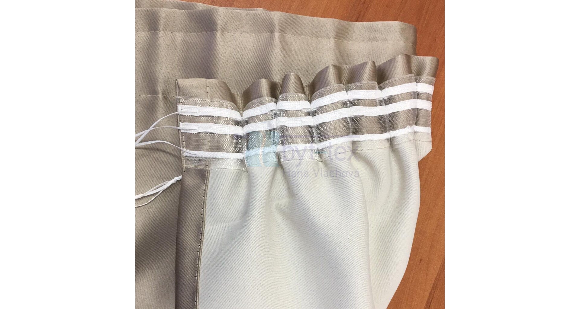 Závěs je všitý do řasící stuhy v poměru 1:1,5, stuha je podšitá o 1cm níže (tzv.výpustek 1cm).